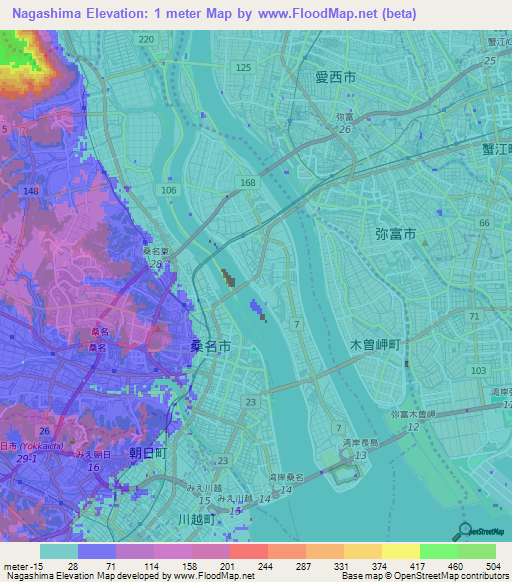 Below is the Elevation map of Nagashima,Japan, which displays range of elevation with different colours.