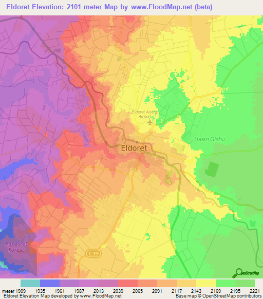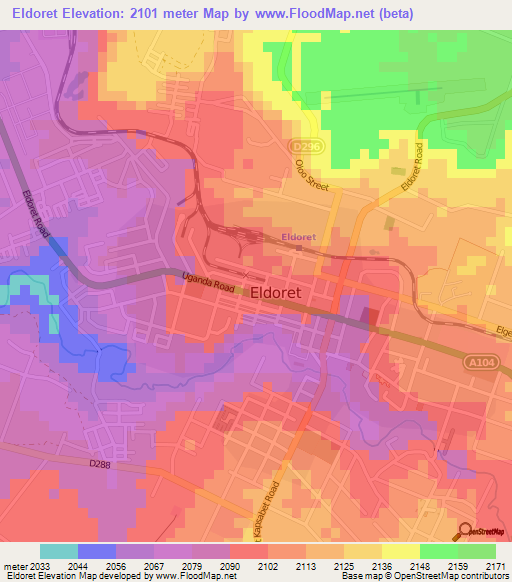 Below is the Elevation map of Eldoret,Kenya, which displays range of elevation with different colours.