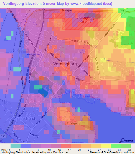 Below is the Elevation map of Vordingborg,Denmark, which displays range of elevation with different colours.