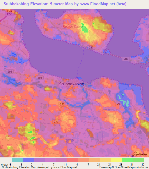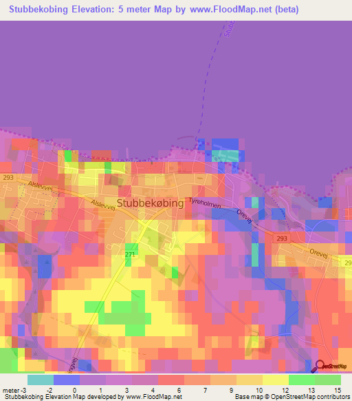 Below is the Elevation map of Stubbekobing,Denmark, which displays range of elevation with different colours.