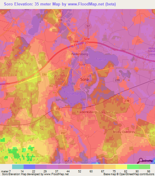 Below is the Elevation map of Soro,Denmark, which displays range of elevation with different colours.
