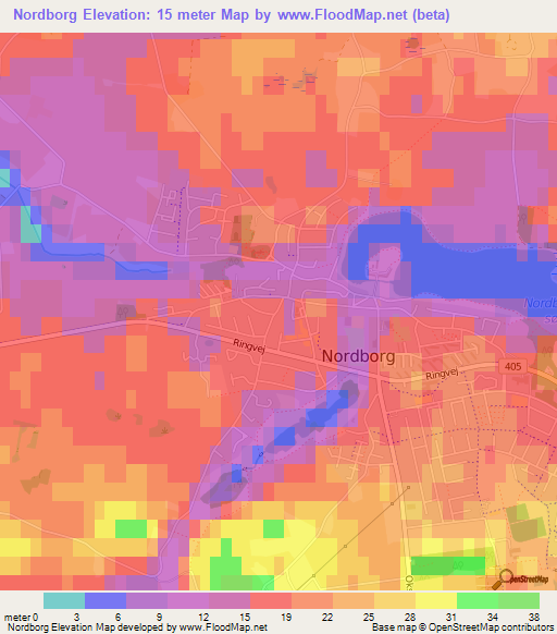 Below is the Elevation map of Nordborg,Denmark, which displays range of elevation with different colours.