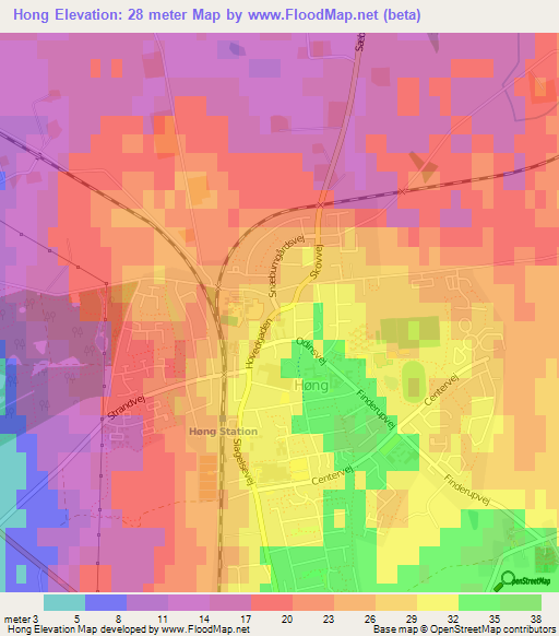 Below is the Elevation map of Hong,Denmark, which displays range of elevation with different colours.