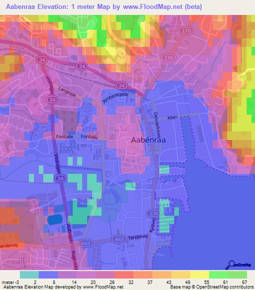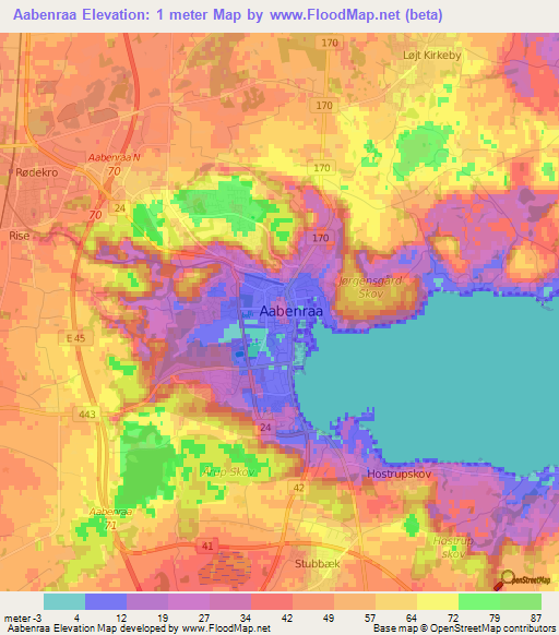 Below is the Elevation map of Aabenraa,Denmark, which displays range of elevation with different colours.