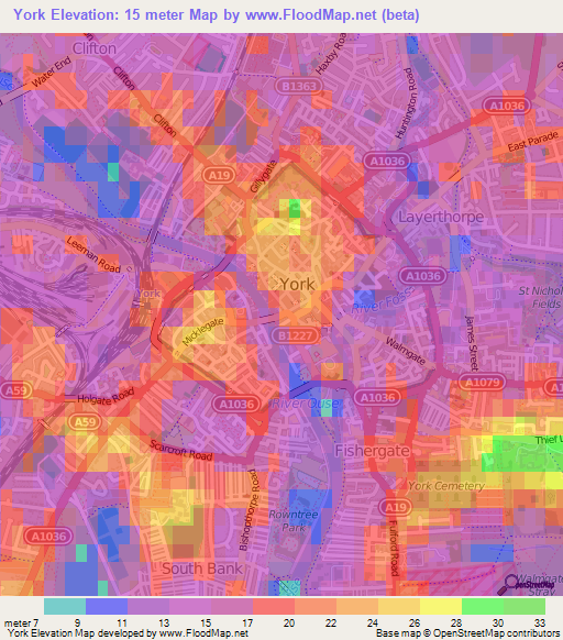 Below is the Elevation map of York,UK, which displays range of elevation with different colours.