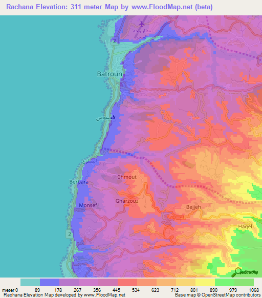 Note:Please note that Rachana,Lebanon Elevation Map is in beta.