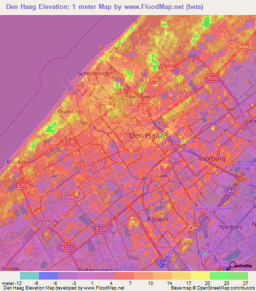 Below is the Elevation map of Den Haag,Netherlands, which displays range of elevation with different colours.