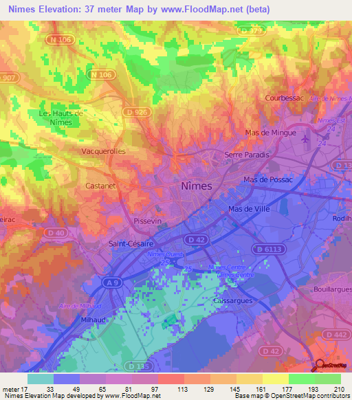Below is the Elevation map of Nimes,France, which displays range of elevation with different colours.
