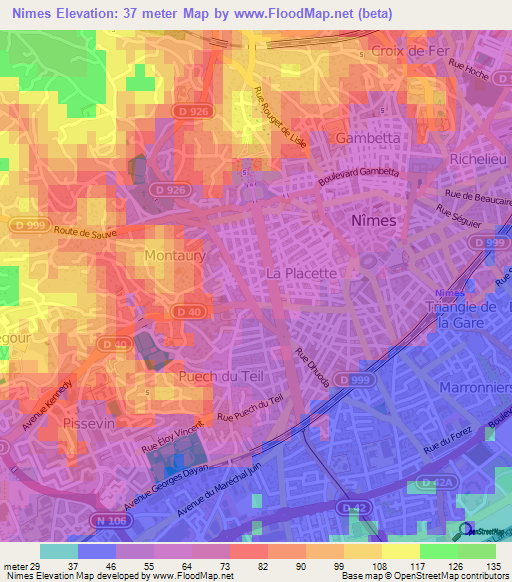 Note:Please note that Nimes,France Elevation Map is in beta.