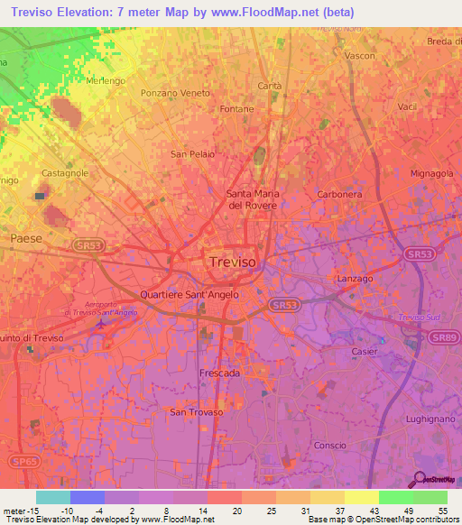 Below is the Elevation map of Treviso,Italy, which displays range of elevation with different colours.