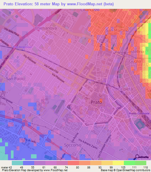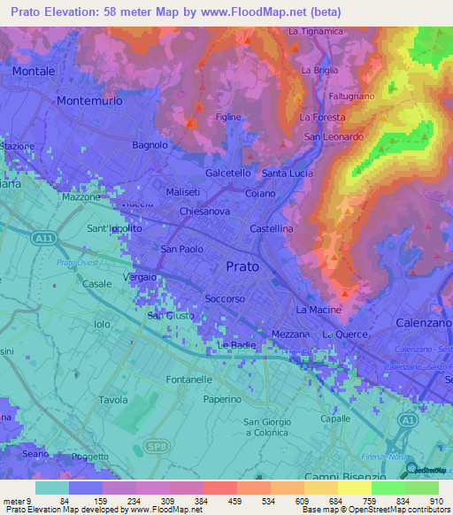 Below is the Elevation map of Prato,Italy, which displays range of elevation with different colours.