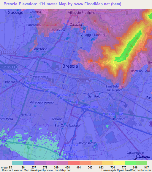 Below is the Elevation map of Brescia,Italy, which displays range of elevation with different colours.