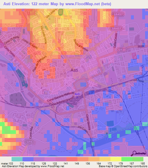 Below is the Elevation map of Asti,Italy, which displays range of elevation with different colours.