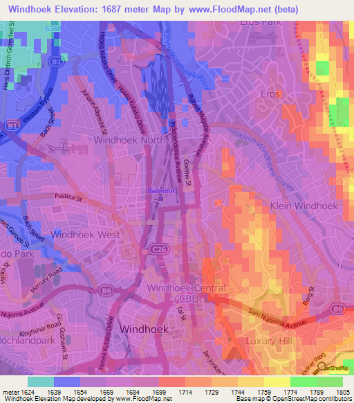 Note:Please note that Windhoek,Namibia Elevation Map is in beta.