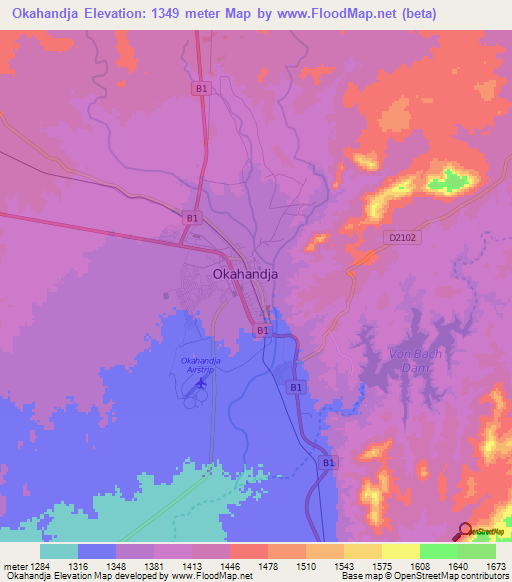 Below is the Elevation map of Okahandja,Namibia, which displays range of elevation with different colours.