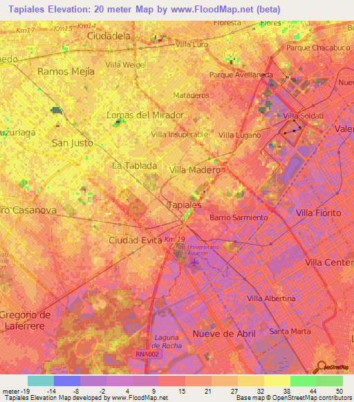 Below is the Elevation map of Tapiales,Argentina, which displays range of elevation with different colours.