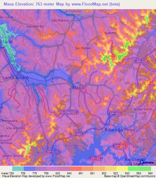Below is the Elevation map of Maua,Brazil, which displays range of elevation with different colours.