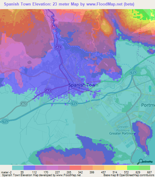 Note:Please note that Spanish Town,Jamaica Elevation Map is in beta.