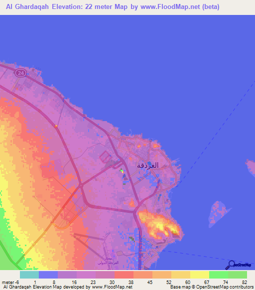 Below is the Elevation map of Al Ghardaqah,Egypt, which displays range of elevation with different colours.