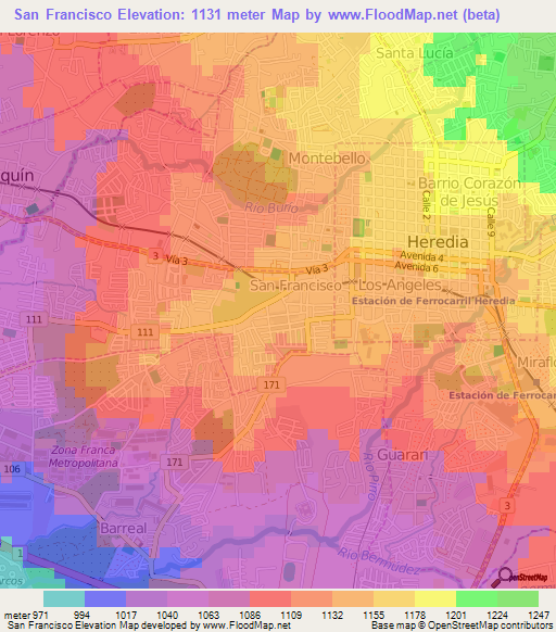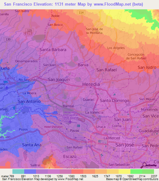 Below is the Elevation map of San Francisco,Costa Rica, which displays range of elevation with different colours.