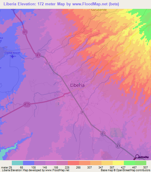 Note:Please note that Liberia,Costa Rica Elevation Map is in beta.