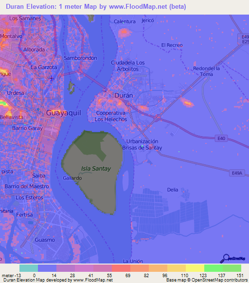 Below is the Elevation map of Duran,Ecuador, which displays range of elevation with different colours.