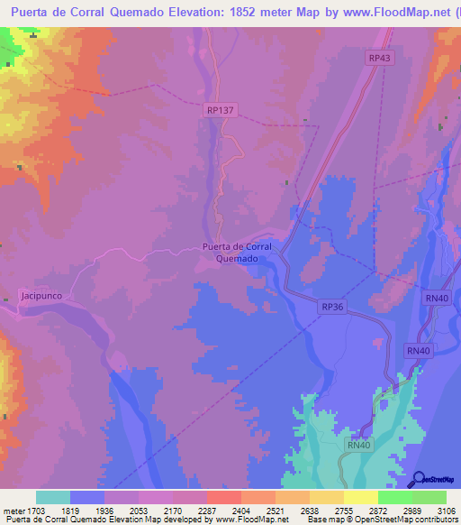Below is the Elevation map of Puerta de Corral Quemado,Argentina, which displays range of elevation with different colours.