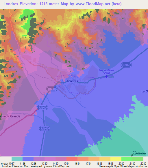 Below is the Elevation map of Londres,Argentina, which displays range of elevation with different colours.