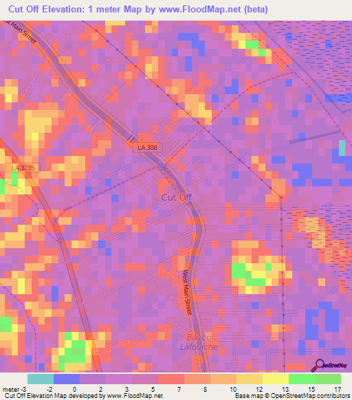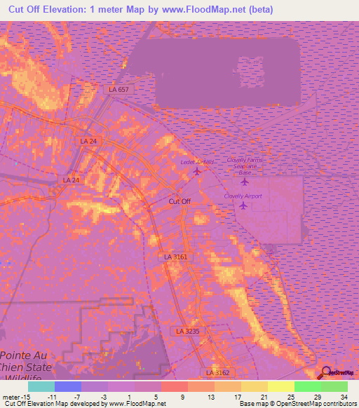 Below is the Elevation map of Cut Off,US, which displays range of elevation with different colours.