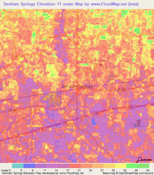 Below is the Elevation map of Denham Springs,US, which displays range of elevation with different colours.