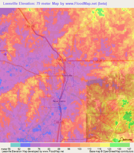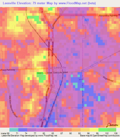Below is the Elevation map of Leesville,US, which displays range of elevation with different colours.