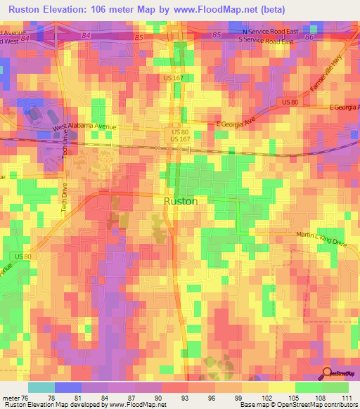 Below is the Elevation map of Ruston,US, which displays range of elevation with different colours.