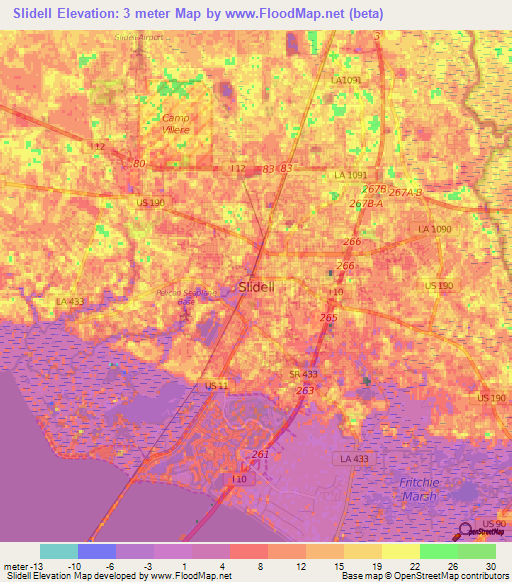 Below is the Elevation map of Slidell,US, which displays range of elevation with different colours.