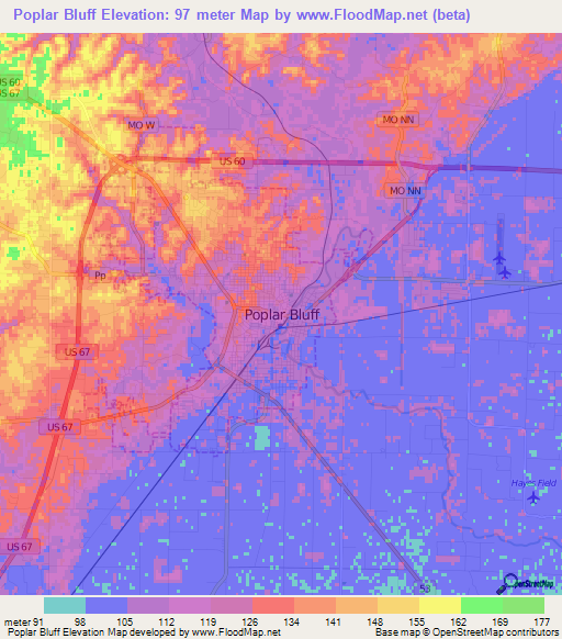 Note:Please note that Poplar Bluff,US Elevation Map is in beta.