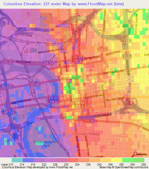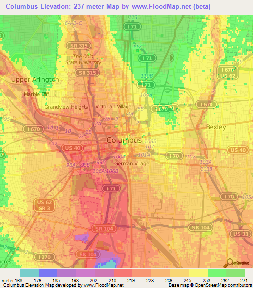 Below is the Elevation map of Columbus,US, which displays range of elevation with different colours.