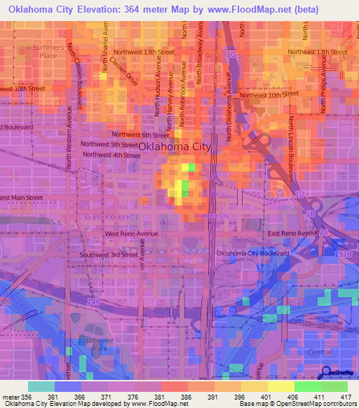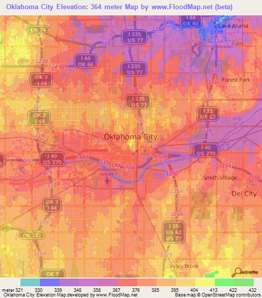 Below is the Elevation map of Oklahoma City,US, which displays range of elevation with different colours.