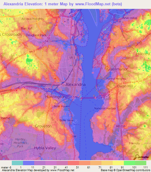 Note:Please note that Alexandria,US Elevation Map is in beta.