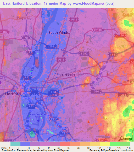 Note:Please note that East Hartford,US Elevation Map is in beta.