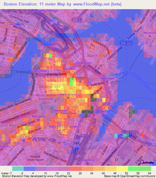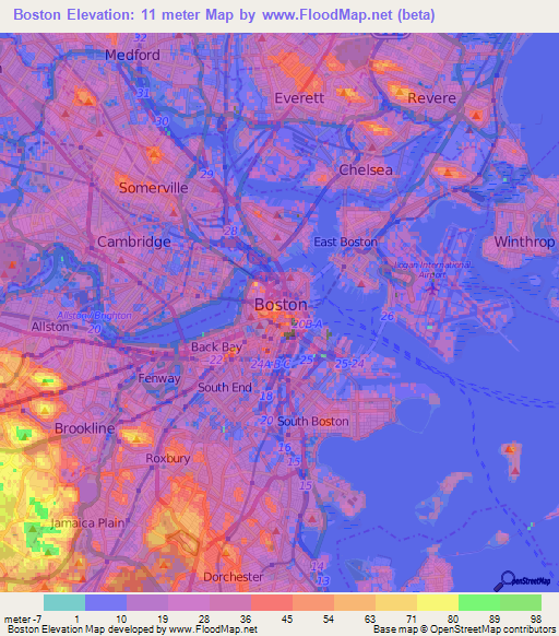 Below is the Elevation map of Boston,US, which displays range of elevation with different colours.