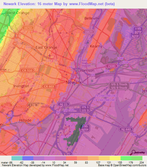 Note:Please note that Newark,US Elevation Map is in beta.