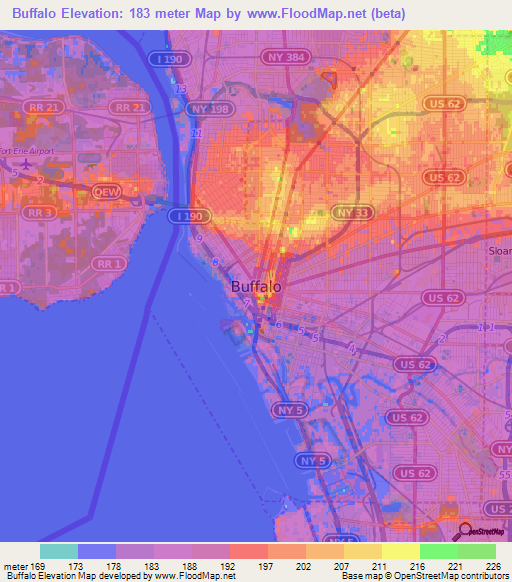 Below is the Elevation map of Buffalo,US, which displays range of elevation with different colours.