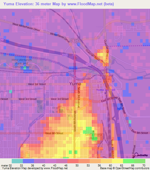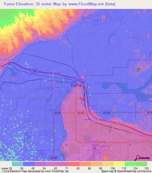 Below is the Elevation map of Yuma,US, which displays range of elevation with different colours.