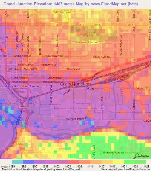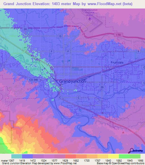 Below is the Elevation map of Grand Junction,US, which displays range of elevation with different colours.