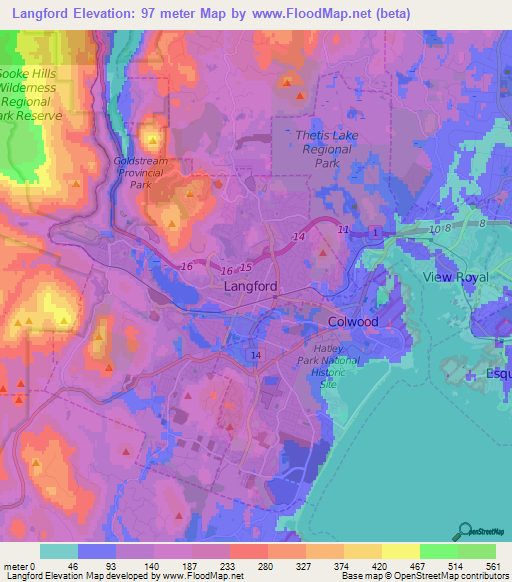 Below is the Elevation map of Langford,Canada, which displays range of elevation with different colours.