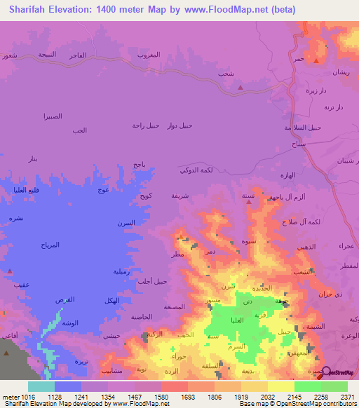 Below is the Elevation map of Sharifah,Yemen, which displays range of elevation with different colours.
