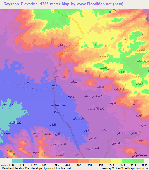 Below is the Elevation map of Rayshan,Yemen, which displays range of elevation with different colours.