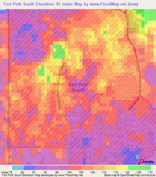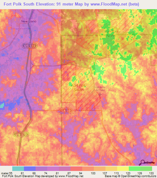 Below is the Elevation map of Fort Polk South,US, which displays range of elevation with different colours.