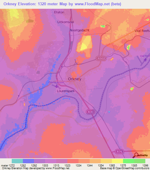 Below is the Elevation map of Orkney,South Africa, which displays range of elevation with different colours.