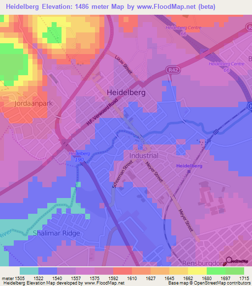 Below is the Elevation map of Heidelberg,South Africa, which displays range of elevation with different colours.